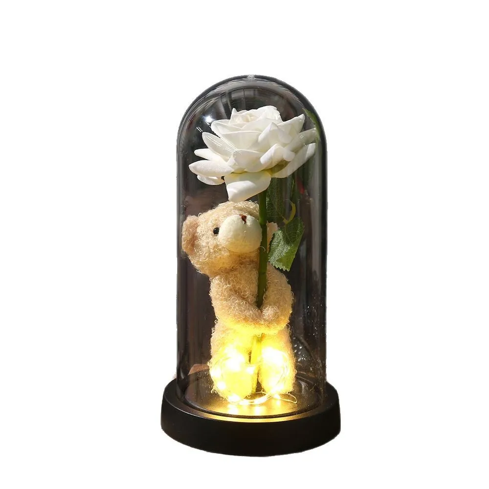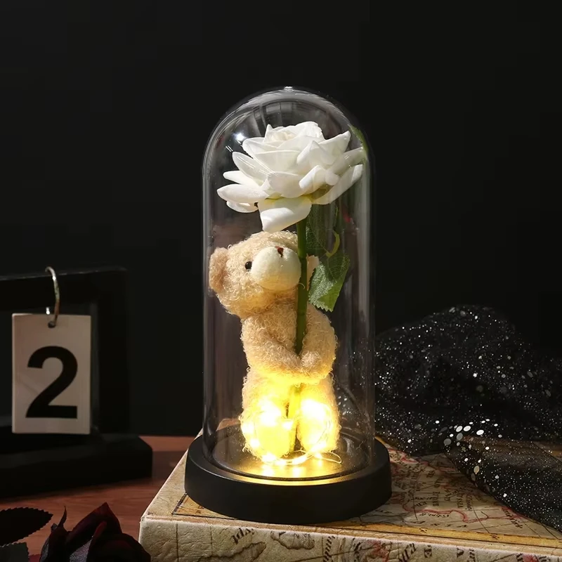 Wieczna róża w szklanej kopule z misiem – dekoracja i prezent