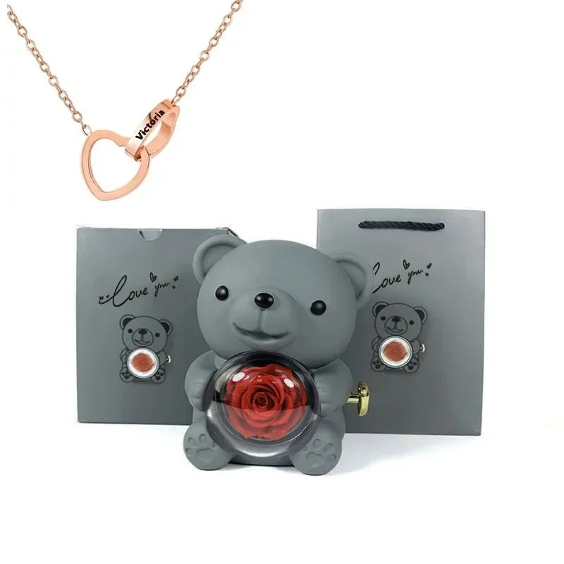 Miś z wieczną różą i personalizowanym naszyjnikiem – prezent na Walentynki