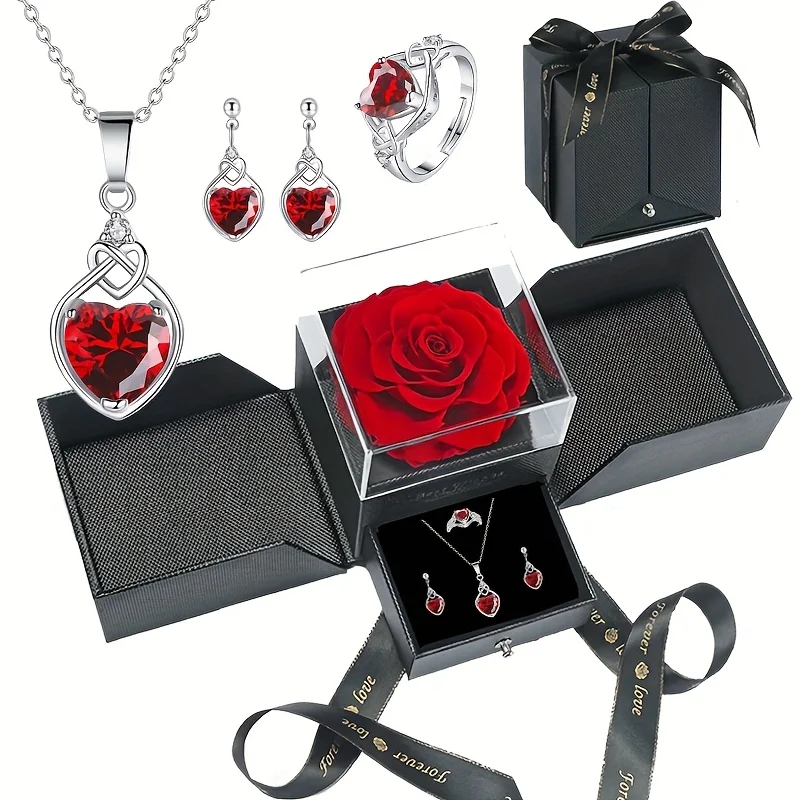 Modny, prosty komplet biżuterii ze stopu metalu z motywem serca (kolczyki, pierścionek, naszyjnik) w pudełku prezentowym z różą