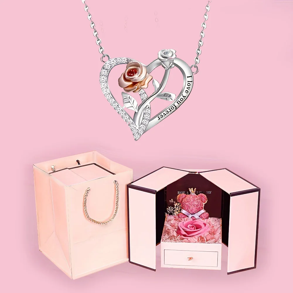 Naszyjnik „I Love You Forever” z uroczym misiem i różą w pudełku – romantyczny prezent urodzinowy dla dziewczyny, nowa moda 2026