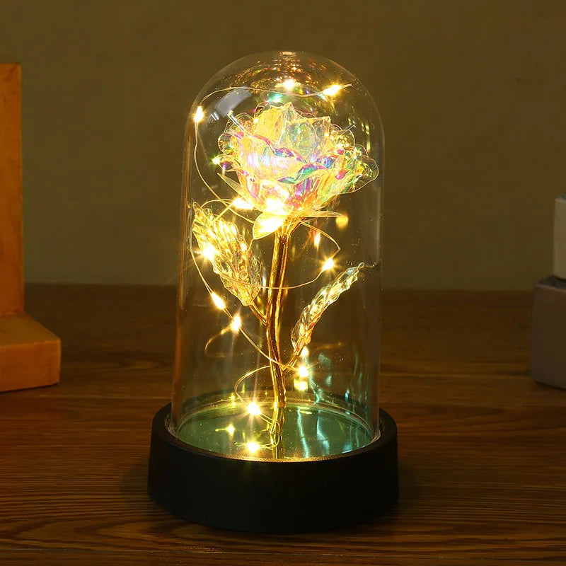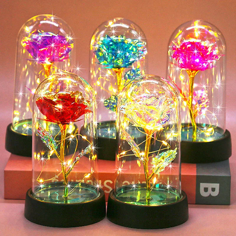 Prezent walentynkowy – wieczna róża z podświetleniem LED, foliowy kwiat w akrylowej / szklanej kopule, dekoracja na Dzień Matki, prezent urodzinowy i na przyjęcia